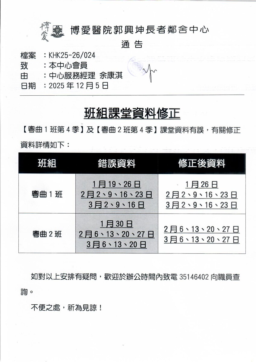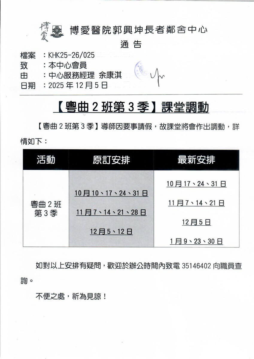 粵曲1班第3季課堂調動